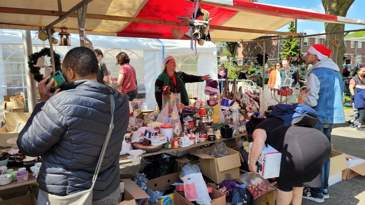 Vrijdag was er vanaf 8 uur ‘s morgen al een grote groep vrijwilligers actief om de boel naar buiten te brengen en het inrichten van de kramen kon rond 10 uur starten.